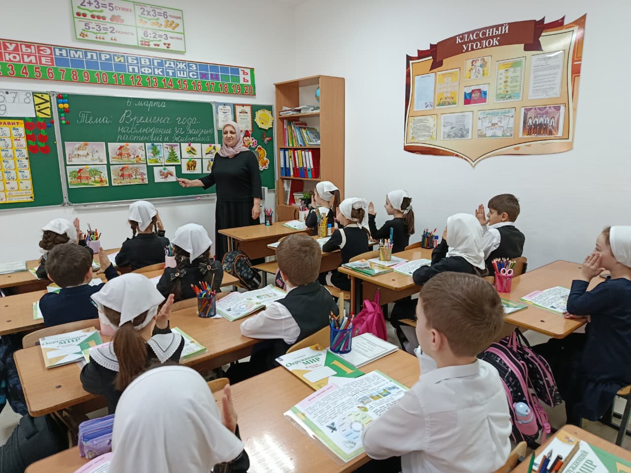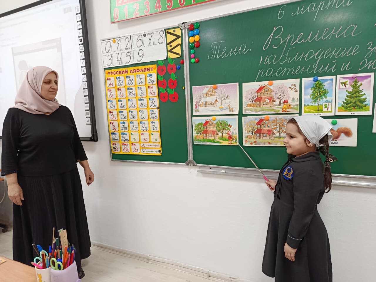 Сегодня, 6 марта, учитель 1 А класса  Тааева М. А.  провела урок окружающего мира на тему «Наблюдение за жизнью животных и растений». Урок прошел на высоком профессиональном уровне. Мадина Абдуллаевна часто применяет  на своих уроках методы поискового характера. С помощью загадок, она умело подвела обучающихся к тому, чтобы дети сами сформулировали тему урока.